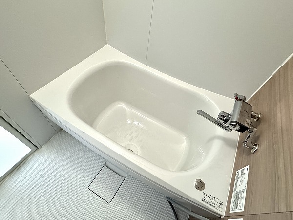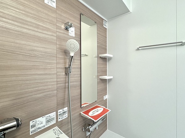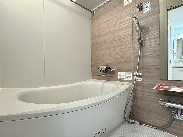 木目のぬくもりとホワイトの爽やかさが調和したバスルーム。追い焚き機能でいつでも快適な湯温をキープでき、浴室乾燥も備わっているので雨の日のお洗濯や花粉の時期のお洗濯も快適ですよ♪