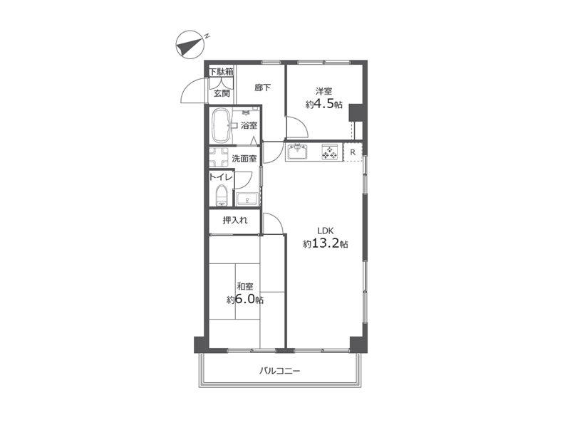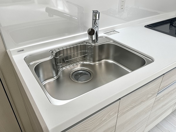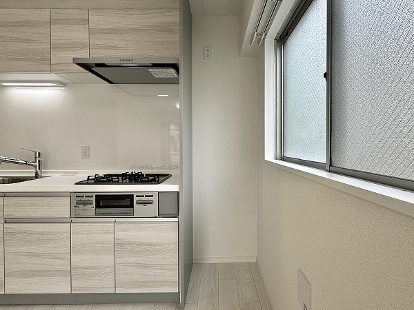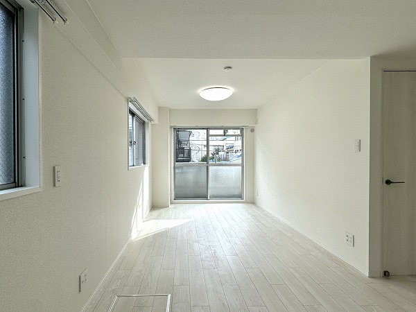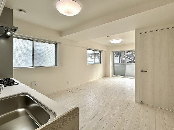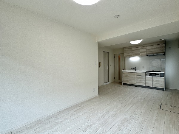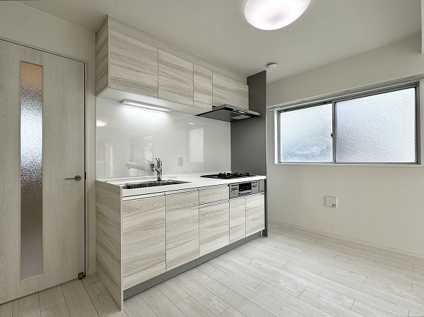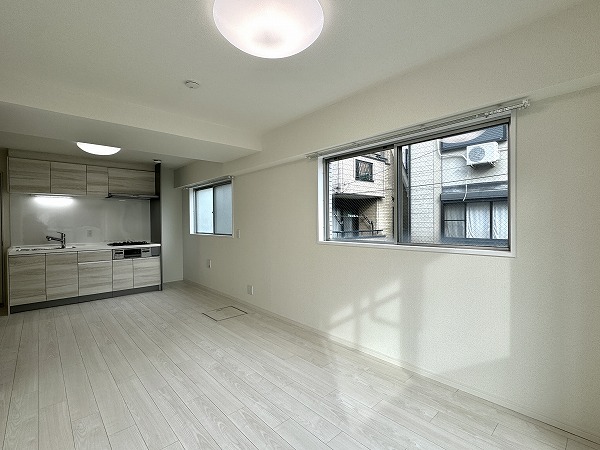 広さ13.2帖のメインルームは、壁付けキッチンで空間をスッキリと。白をベースに木目のあたたかさが加わったナチュラルなデザインで、どんな家具も馴染みやすいのが嬉しいポイント。明るく開放的な雰囲気で、毎日を気持ちよく過ごせそうです。