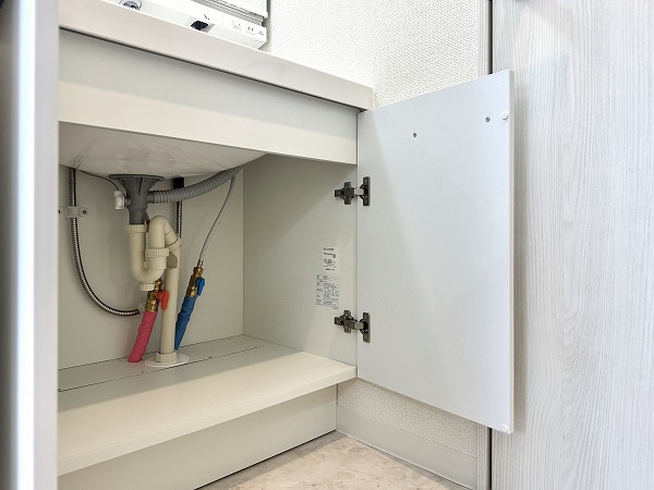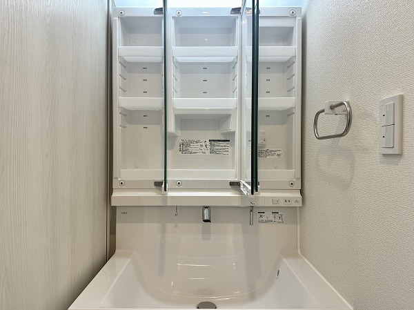 3面鏡の洗面化粧台は鏡裏のミラーキャビネットに加え、下部にも収納スペースを確保。化粧品やタオル、掃除用具などを整理できいつでもすっきりした状態を保てます。右側の洗濯機置き場と連動した動線により、洗面台で漬け置きした衣類をそのまま洗濯機へ移すこともスムーズ。