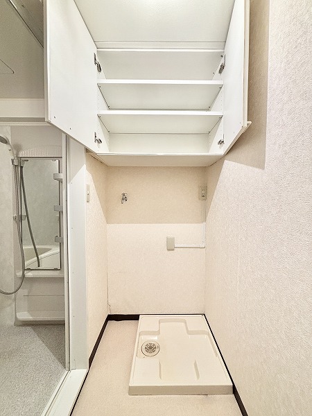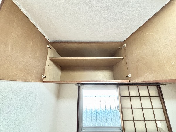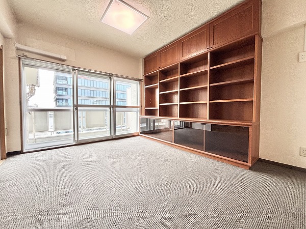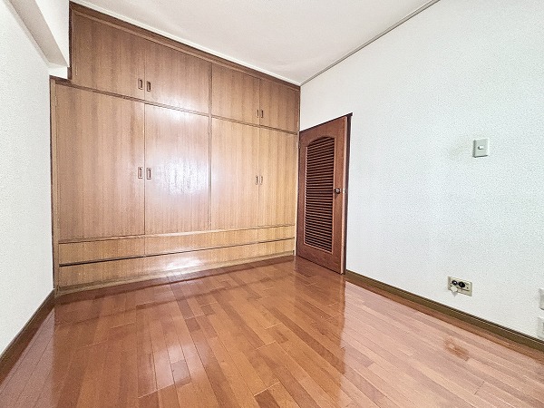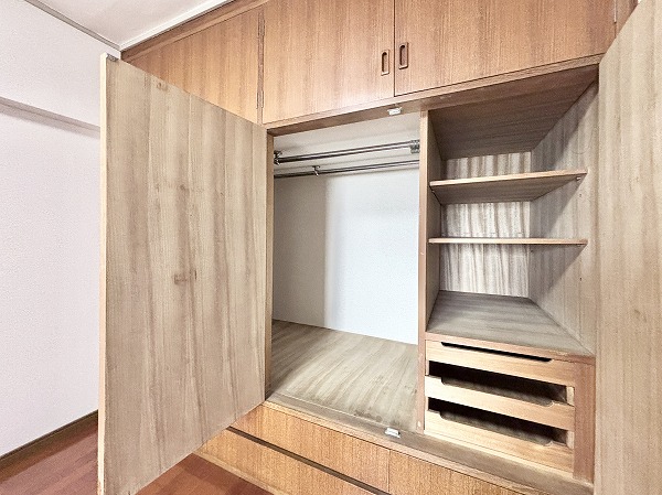 玄関入ってすぐの洋室は約6.0帖です。フローリング仕様でベッドを置いてもゆとりのある広さ。独立性が高いので、主寝室にぴったりですね♡ワイドな収納棚だけでなく、上部収納も備わっているため、とっても便利です◎