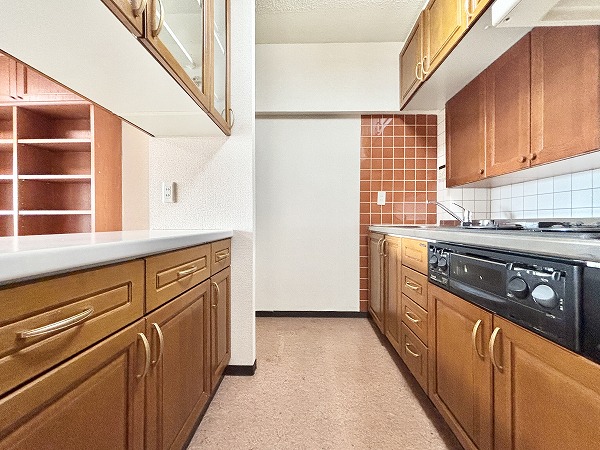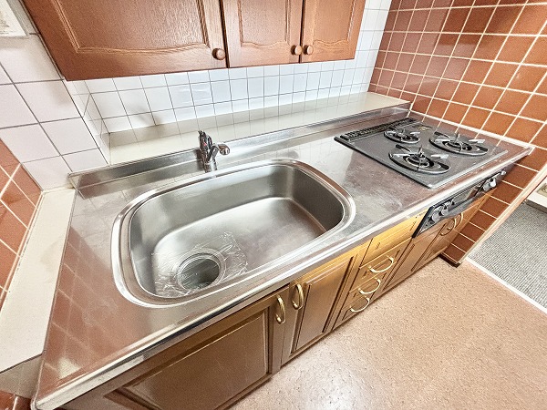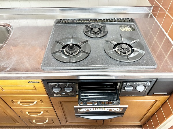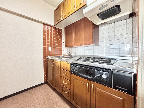 キッチンはレトロな雰囲気がお洒落なデザイン✦カップボードが設置されているので、ついつい増えがちなキッチン用品もたっぷり収納できます。3口コンロにグリルも備わっているため、お料理好きの方も満足していただけますよ♩