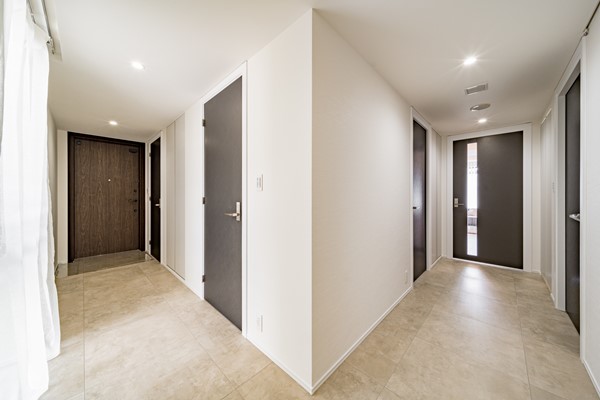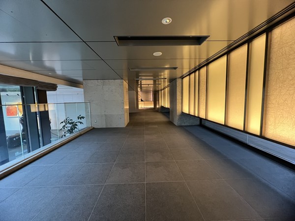 建物へのアプローチは段差のないフラットな造りで、ベビーカーやキャリーケースの移動もスムーズ。エントランス入口は通りから奥まった位置に設けられており、道沿いから館内の様子が見えにくい設計に。外部からの視線を自然に遮り、居住者のプライバシーにしっかりと配慮されていました。