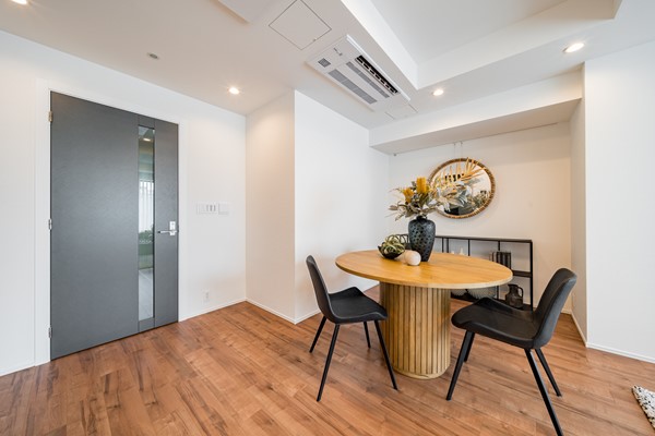 約15.5帖のリビングダイニングは、ゆとりある広さで大型ソファやダイニングセットを配置しても窮屈さを感じません。天井にはビルトインタイプのエアコンを採用しており、空間がすっきりとした印象に。大きな開口部からはたっぷりと陽光が入り、明るさと開放感を兼ね備えた快適な居住空間です。