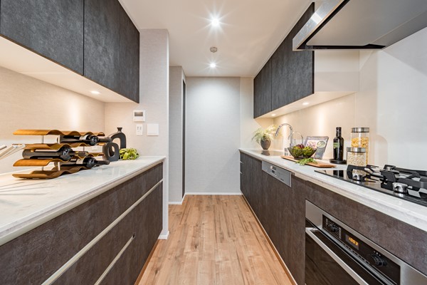 約4.4帖の独立型キッチンはしっかりと扉で仕切られており、調理中の煙や匂いがリビングに広がりにくい設計。グリル付きコンロで複数の料理を同時に進めることができ、調理効率も良好。背面にはカップボードが設置されており、食器や家電をすっきりと収めてくれます♪