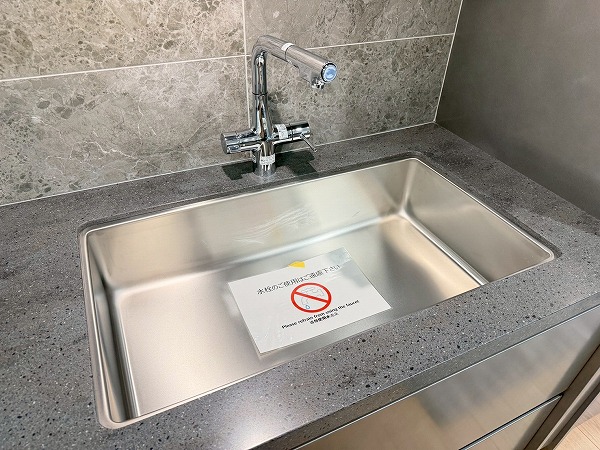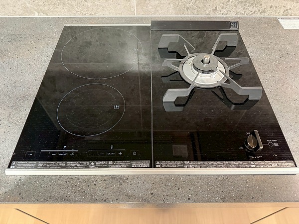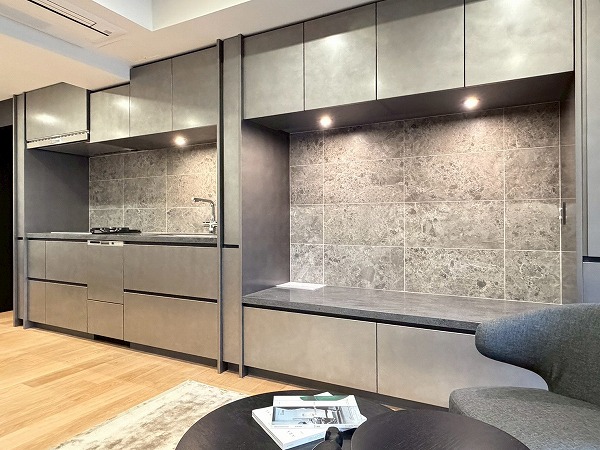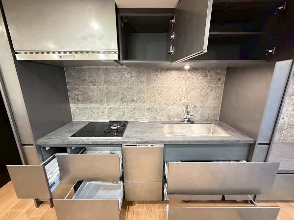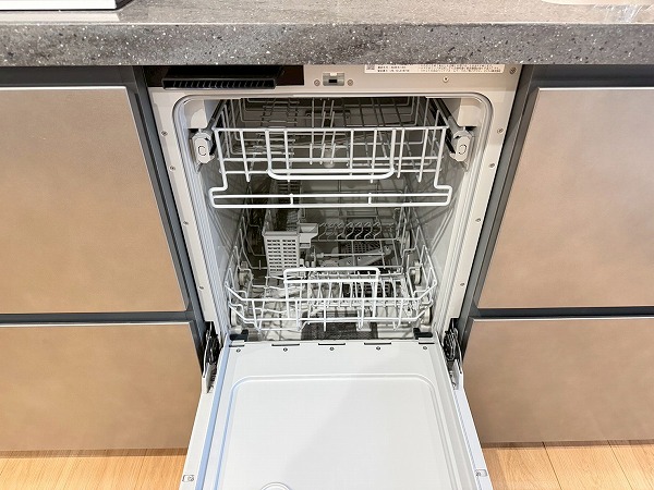 調理に集中できる壁付タイプのシステムキッチン。複数品の同時調理が可能なグリル付き3口コンロ、便利な食洗機・浄水器が備わっており、日々の家事負担を軽減。作業スペースもしっかり確保されているため、調理から片付けまでの流れがスムーズです。まさにシンプルイズベストなデザインですね。
