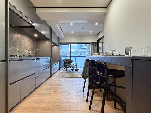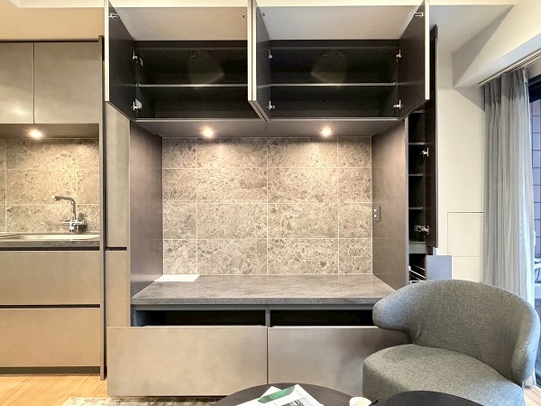 壁側にはカウンターデスクが備わっていて、カフェのような雰囲気で作業をしたり、コーヒーを楽しんだりと日常の過ごし方に幅が生まれそう。シンプルに整えられた内装が、家具やインテリアを引き立て、住まう人の好みに合わせて空間をつくり込めるリビングです♪