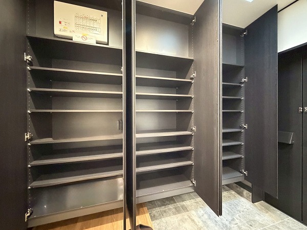 大容量サイズのウォークインクローゼット。季節もののコートや丈の長いワンピース、かさばりやすいダウンジャケットなども綺麗に保管できる便利なスペースです。玄関に近いので、アウトドア用品なども収納可能。シューズボックスも別で備わっています。