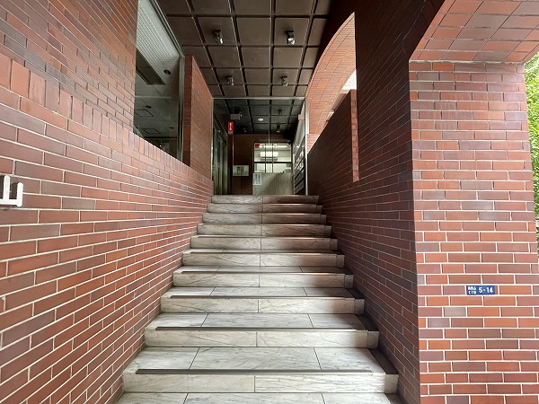階段を上って辿り着くエントランスは、通り沿いとは思えない落ち着き。外部からの視線を遮る壁が、安心感のあるプライベート空間を演出しています。