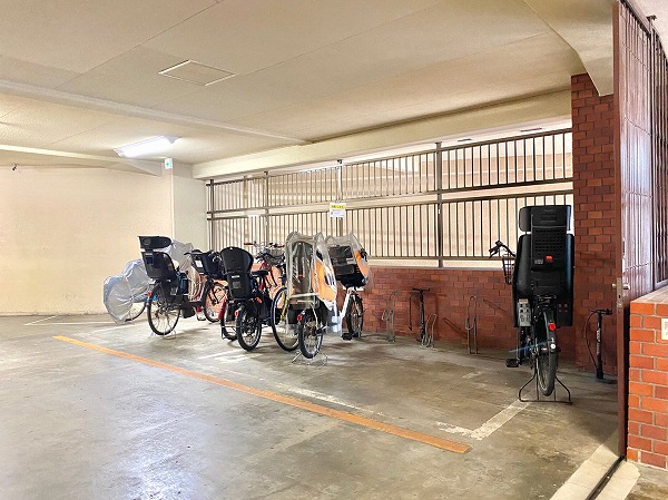 駐車場はビルトイン仕様。雨の日でも濡れずに乗り降りができるのは嬉しいポイント。同スペースには駐輪場も設けられていました。