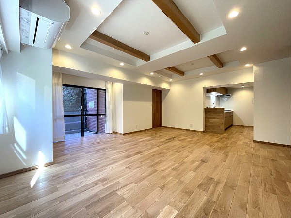 今回ご紹介するのは3階部分の一室。スケルトンからフルリノベーションが施された79.09㎡の2LDKで、2〜3人でもゆとりを持って暮らせるサイズ感です。室内に入ると天然無垢オーク材のやわらかな木目が視界に広がり、思わず深呼吸したくなる心地よさ。約21.4帖のLDKは2面採光につき、陽当たり・風通しともに良好です。家具の配置もしやすく、ダイニングとリビングを緩やかに分けたゾーニングも楽しめそう。さらに最長10年のアフターサービス保証付きという安心感も魅力のひとつです。