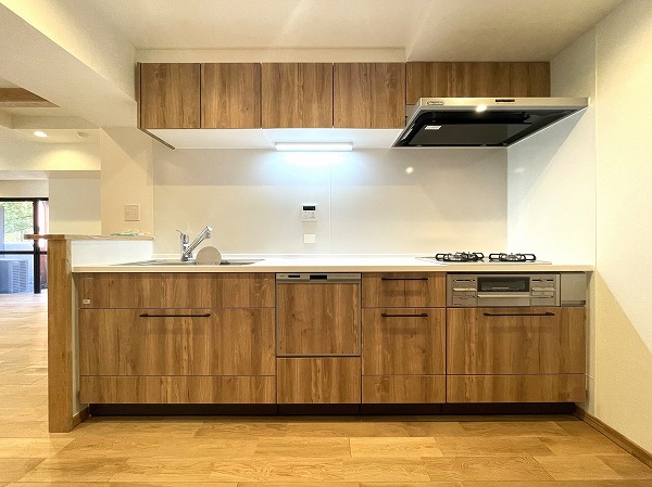 内装と美しく調和するシステムキッチンは、あえて奥まった配置にすることで独立性を高めています。生活感が出にくく、空間全体をすっきりと保てるのが嬉しいところ。グリル付きコンロや食洗機、ゆとりあるワークトップなど、料理好きの方にもご満足いただける設備が揃っていました。