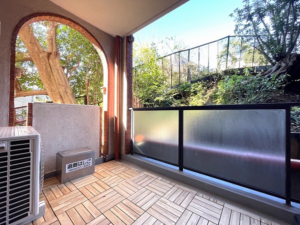 ウッドタイル仕上げのバルコニーは6.74㎡で、外にいながらもどこか温もりを感じる空間。緑を望む眺めが日常に安らぎを添えます。サイズは控えめですが、椅子を置いて読書やひと息つく時間を過ごすには十分な広さです✿