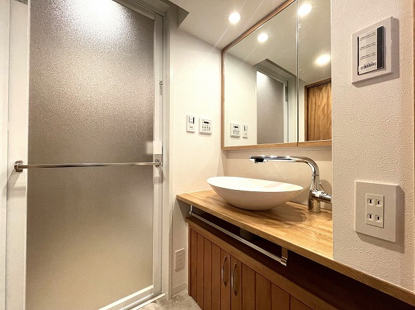 トイレスペースにも木目デザインを取り入れ、住まい全体に統一感を演出。ウォシュレットや手洗いカウンターを備え、来客時にも配慮された仕様です。ミラーも設置されているため、さっと身だしなみを整えられるのも便利なポイント。