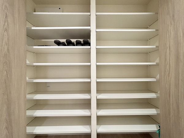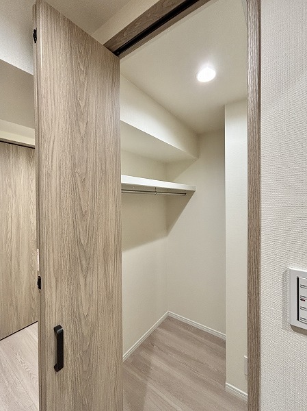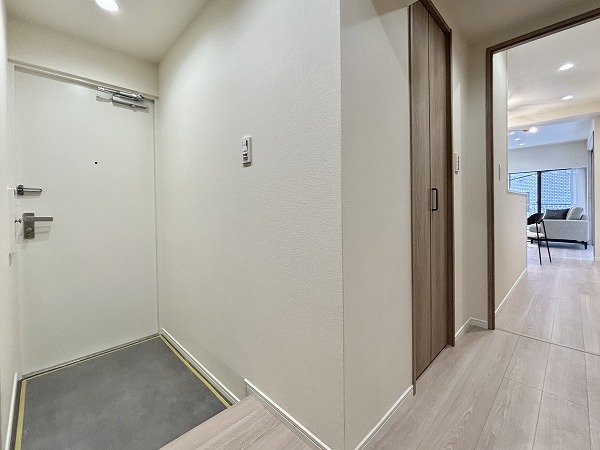 玄関扉を開けると、人感センサー付きのライトがパッと点灯します。わざわざスイッチを探す手間が省けますね。シューズボックスは大容量で、オールシーズンの靴を綺麗に整頓できるはず。また、廊下にもウォークインクローゼットが!収納力の高さは何よりの魅力です。