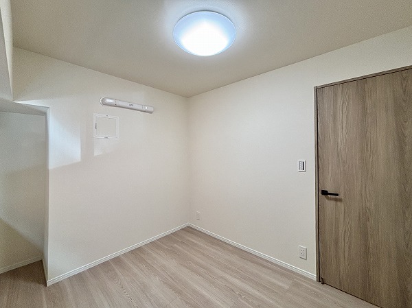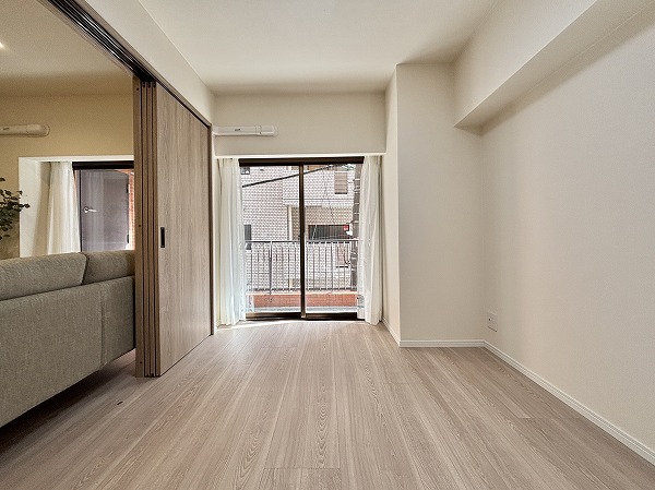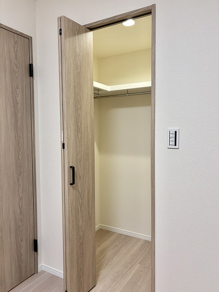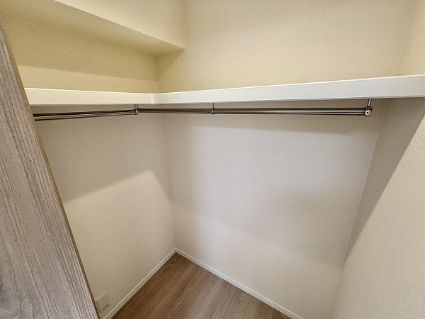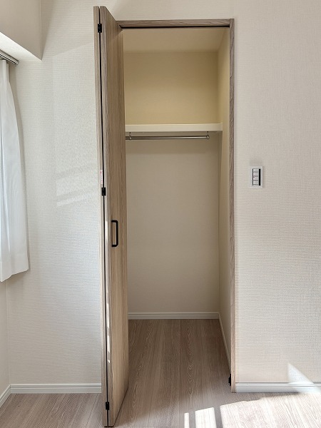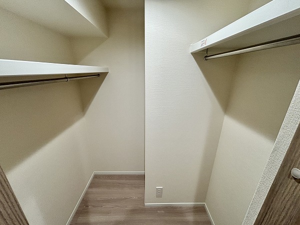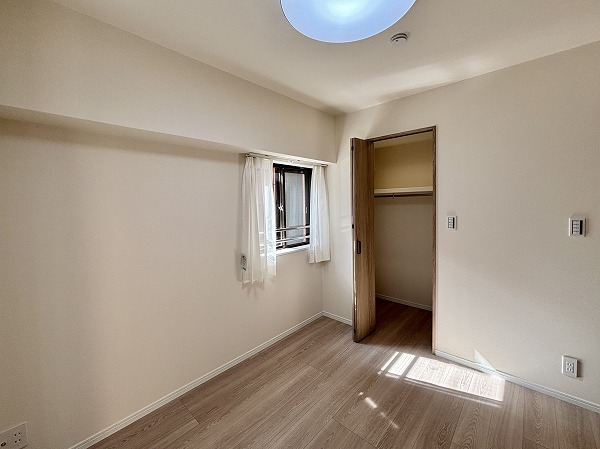 リビングダイニングキッチンに面したこちらの洋室はおよそ5.8帖。2面に窓があり、通気性に優れています。引き戸が大きく開くので、普段は戸を開けて空間を広く見せるのも良さそうですね。収納力バッチリなウォークインクローゼットもご用意。