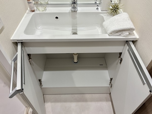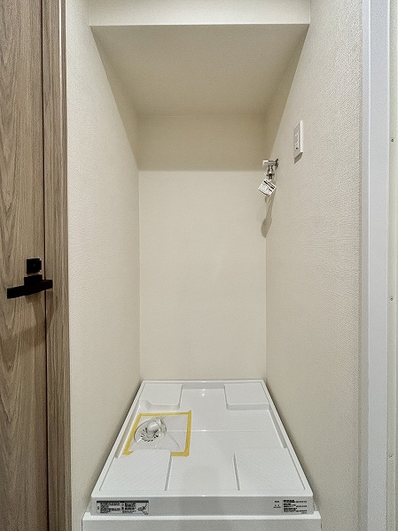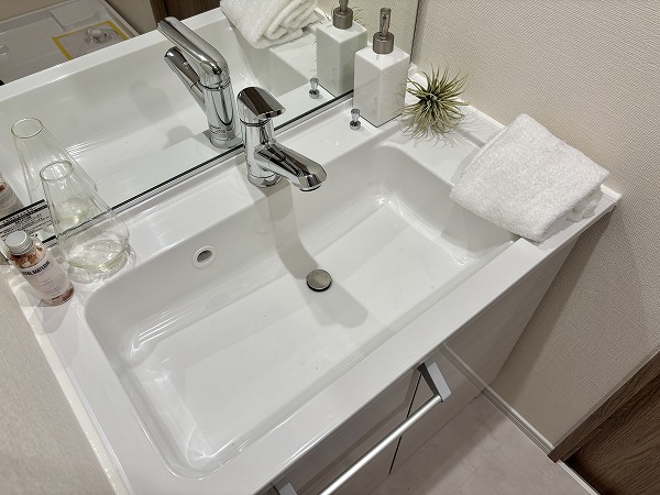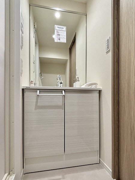 サニタリールームは玄関正面に。これならご帰宅後すぐに手を洗えて清潔的ですね。洗面化粧台には大きなミラーが備わっていて、お顔全体をしっかり確認できますよ。背面には洗濯機置き場が。上部に収納がないので、後付けするともっと使い勝手が良くなります。