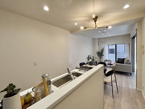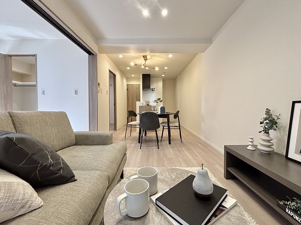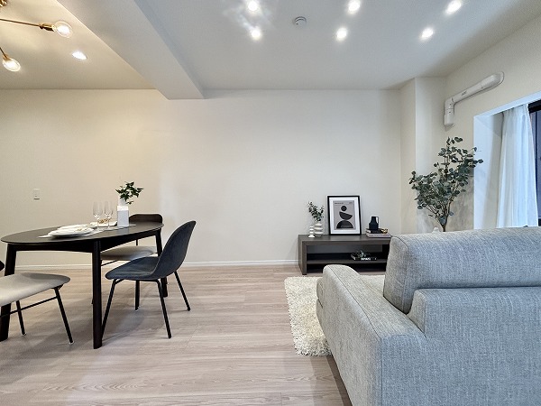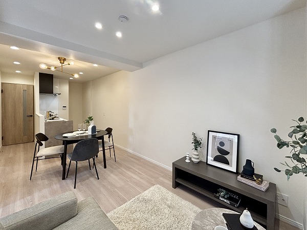 リビングダイニングキッチンはおよそ12.9帖。横に長い造りになっていて、リビングダイニング部分を広く確保することができますよ。大きなソファやラグなども設置しやすそう。間接照明がしっかり備わっているためお部屋全体が明るく居心地が良かったです。
