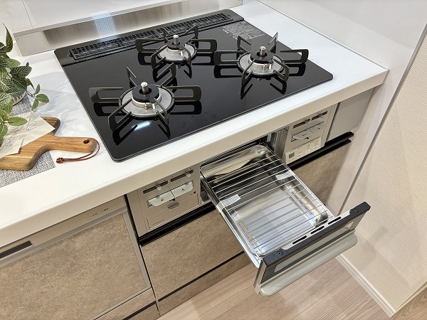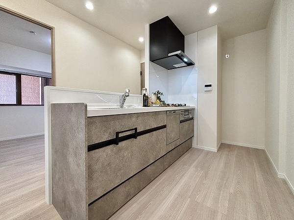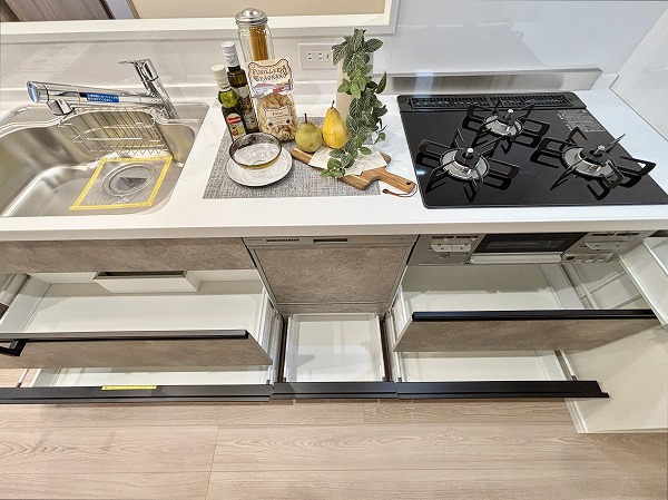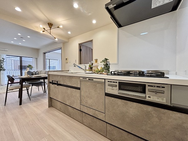 お部屋の雰囲気にマッチした、淡いカラーリングのキッチンに新規交換されています。ワークトップが広く、食材の下ごしらえや盛り付けがしやすそう。シンクも幅が広いデザインなのが嬉しいですね。他にも食洗機や3口のガスコンロを搭載しており、自炊をしっかり行えます。