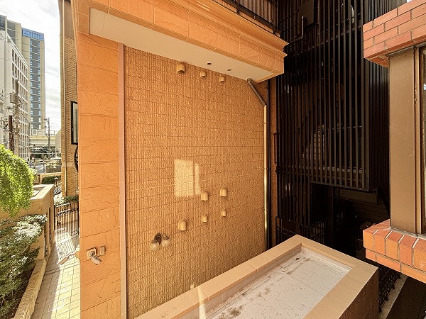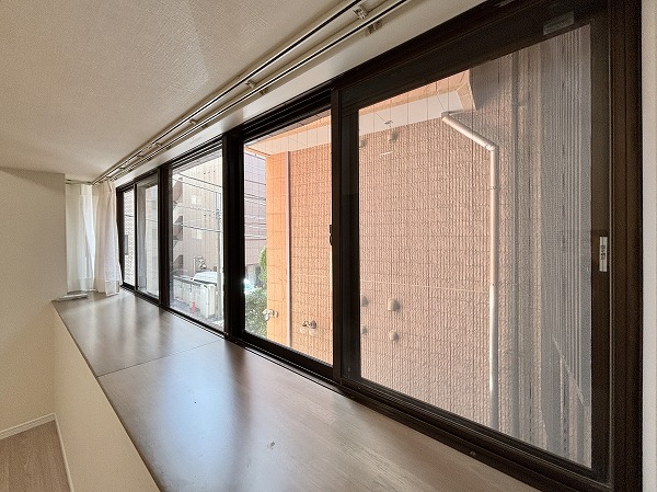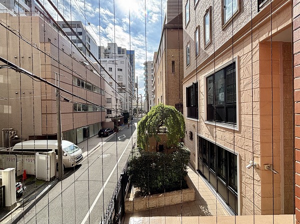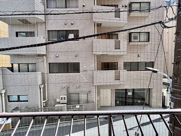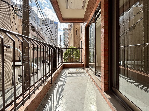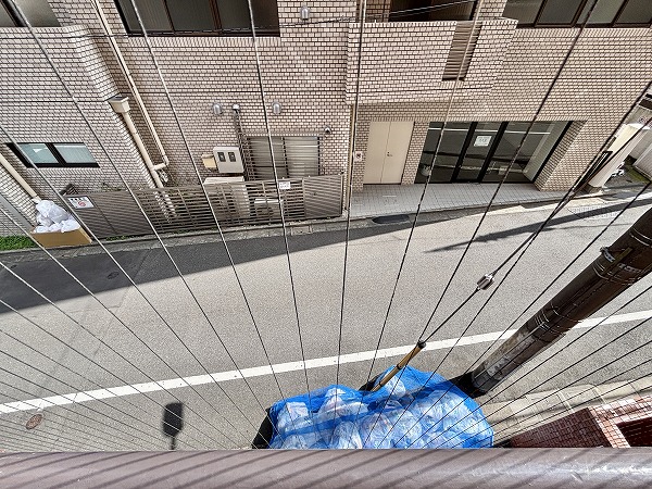 メインルームと、およそ5.8帖の洋室から出入り可能なバルコニーはおよそ5.72㎡。目の前には建物があるものの、横から光が射し込むのでお洗濯物は良く乾きそう。通行人の視線が気になる方は、レースカーテンなどをご利用ください。