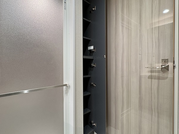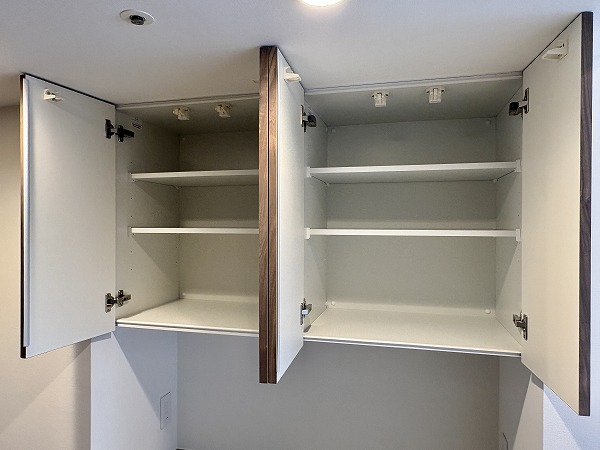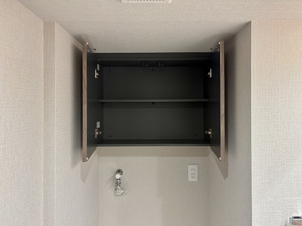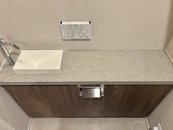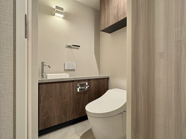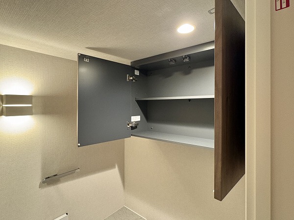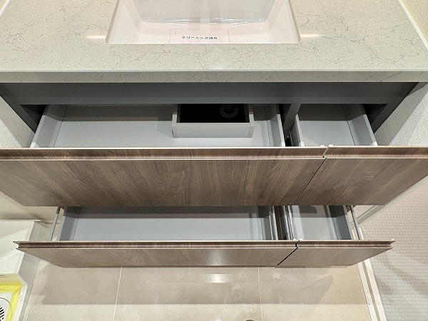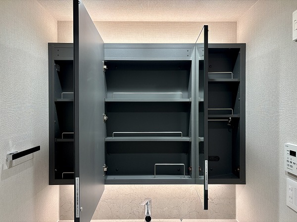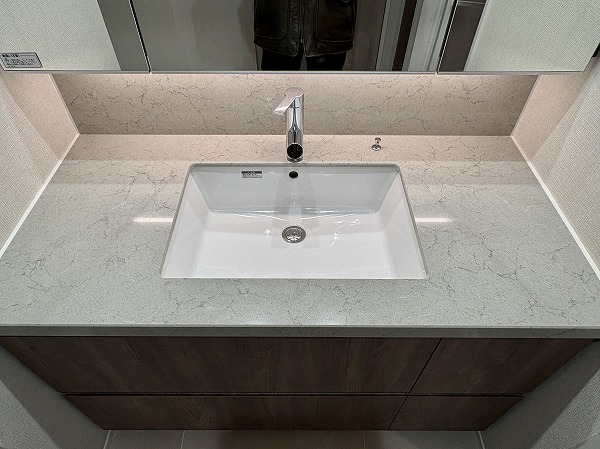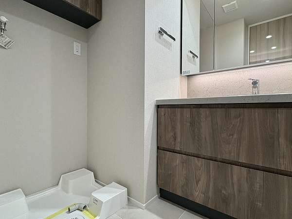 パウダールームはこちら。清潔感があり木目調の棚がオシャレなこの空間は、ストレスなく快適に利用していただけます。洗面台は広々としており、朝の身支度もはかどるのが嬉しいポイントです◎