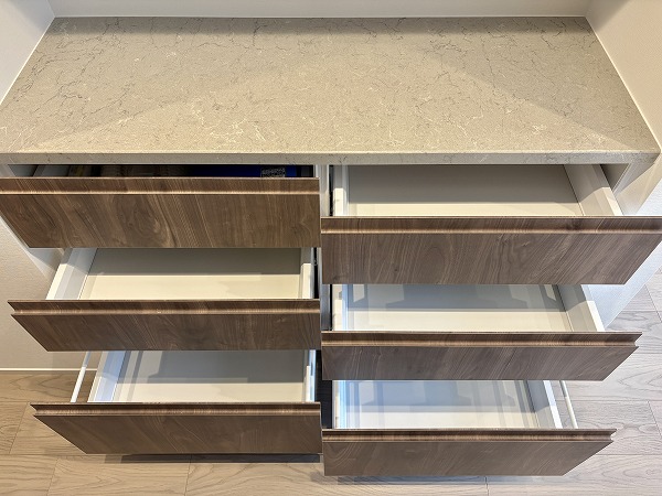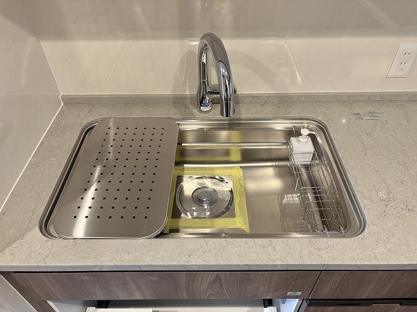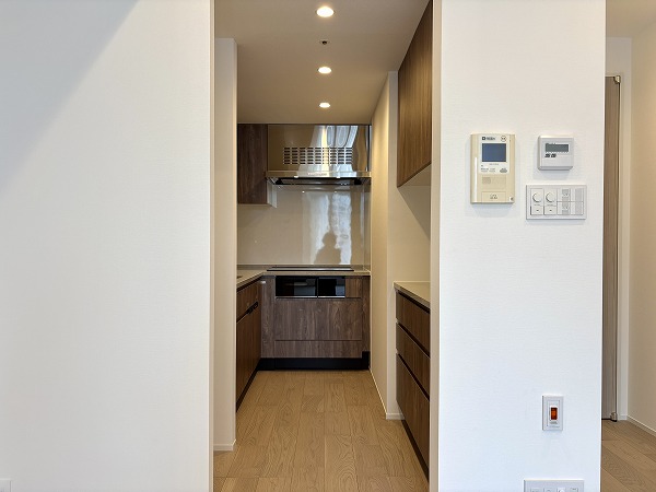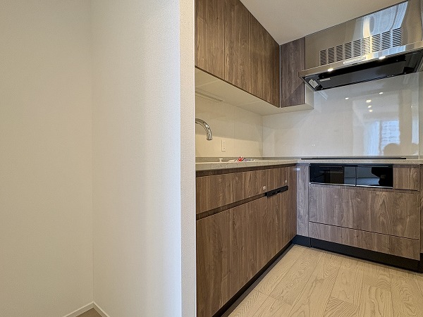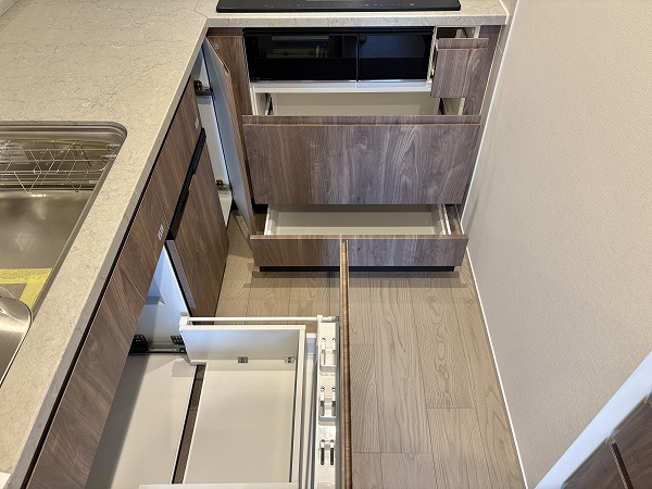 コの字型の配置がクールなキッチン。調理に没頭できるこの空間は、お料理がお好きな方にオススメです。前面と背面に十分な収納を備えており、新たに収納を用意する必要はございません◎リビングダイニングまで目が届き、小さいお子様をお連れの方も安心です。