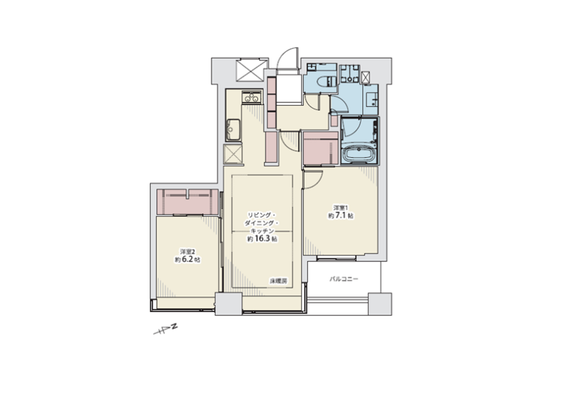 LDKは約16.3帖の広さ。縦長の構造により壁面が長いため、ダイニングテーブルやソファ・収納家具などのレイアウトを決めやすいです◎床暖房を完備しているため、冬場は乾燥を防ぎつつお部屋を暖めることができます。