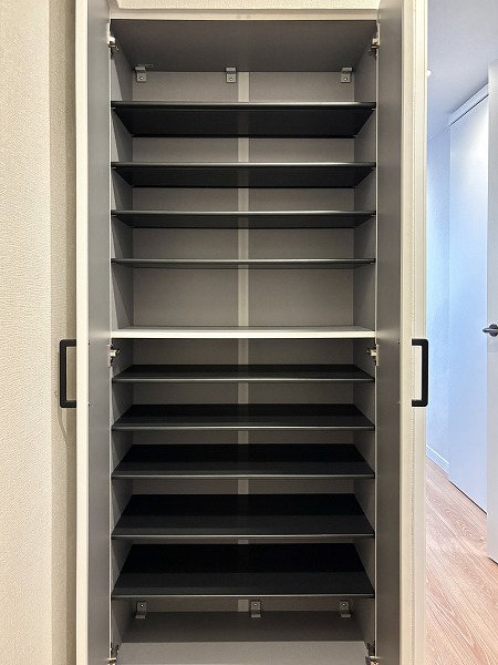 玄関は外からの視線を遮るアルコーブ付き。白を基調としたシンプルなデザインで、写真やリースのディスプレイも楽しめます。シューズクローゼットは可動棚仕様で、様々な靴を整然と収納可能です。