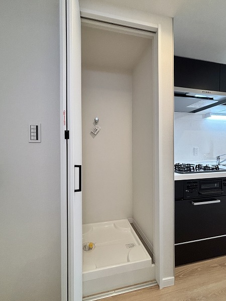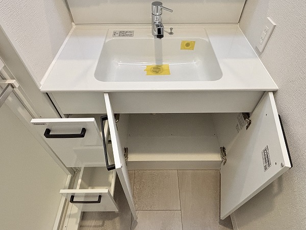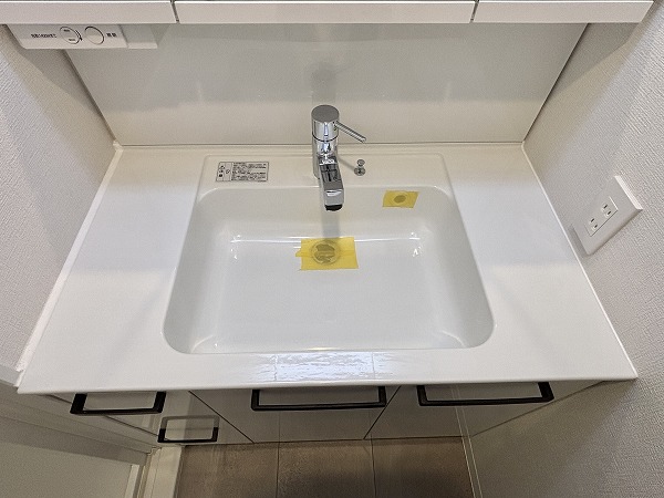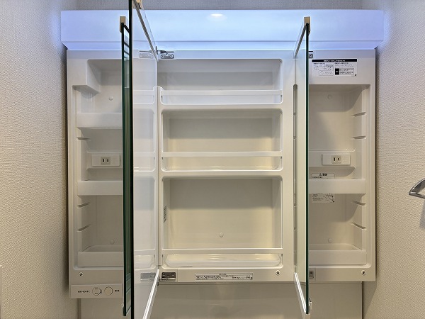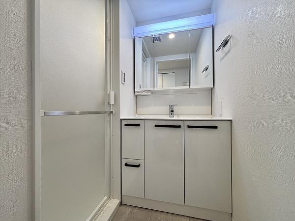 清潔感のあるホワイトベースのサニタリースペース。洗面台、脱衣所、バスルームがまとまった設計で、洗濯機もすぐ隣に置けます。3面鏡には3つのコンセント付きで、身支度や家事もスムーズです。