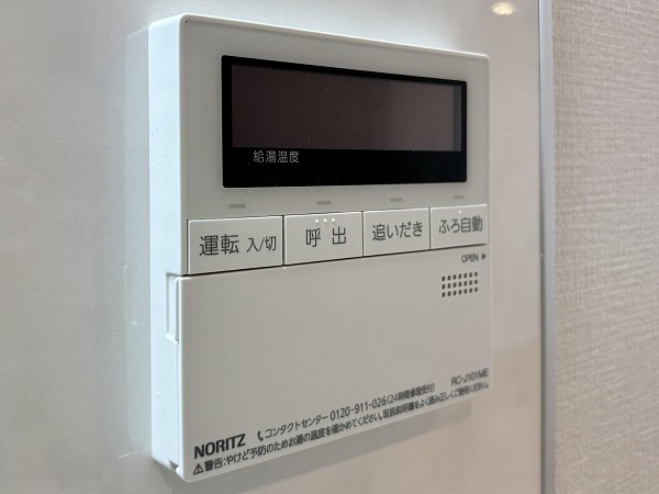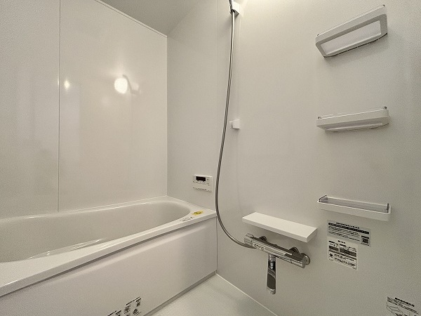 機能性を備えたシンプルな浴室。排水性の高い床材で清潔を保ちやすく、シャンプーラックも3つ備わり小物収納に便利です。オートバスと追い焚き機能で、毎日快適なりラックスタイムを楽しめますよ♡