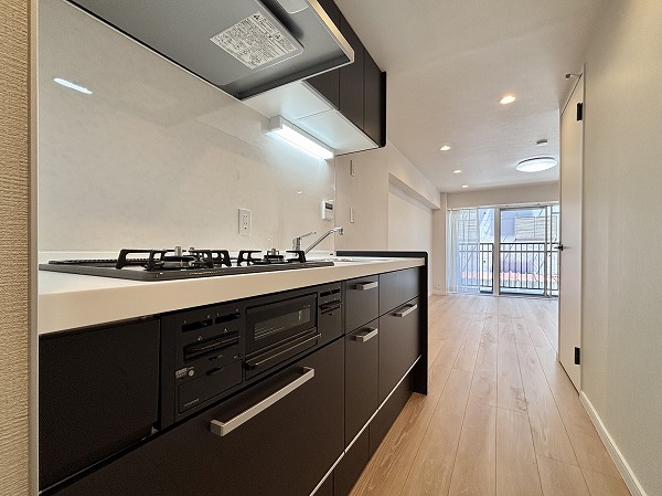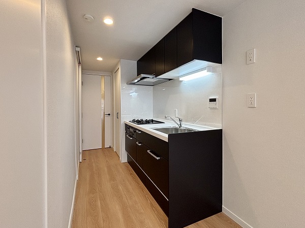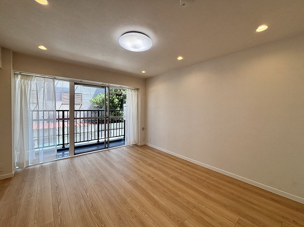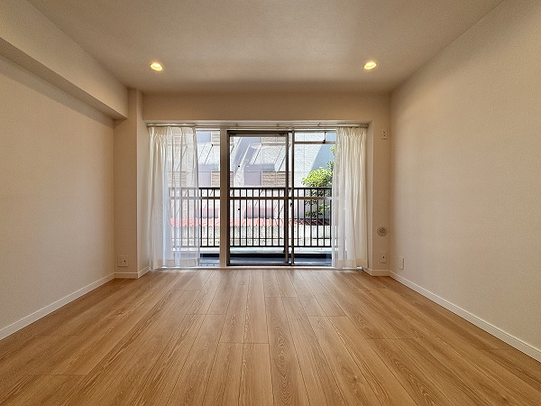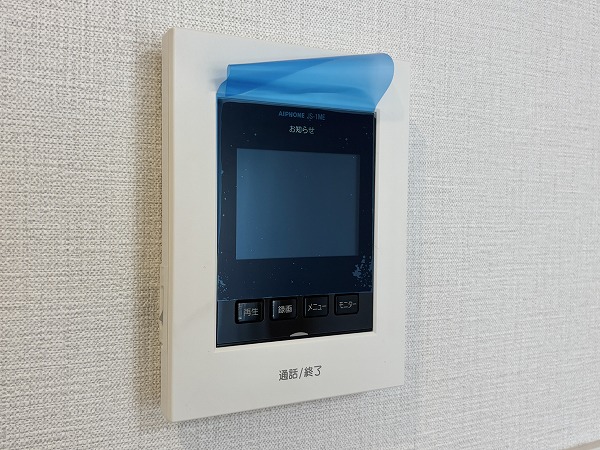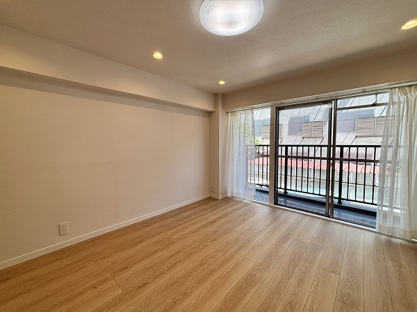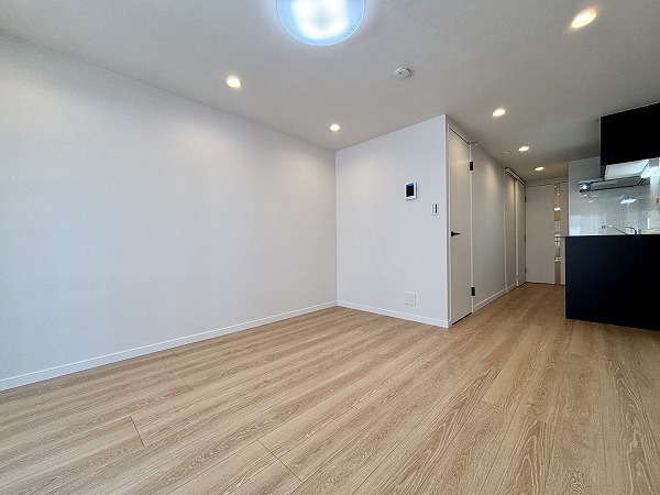 約11.7帖の居室は、日差しがたっぷり差し込む南東向き。キッチンがコンパクトな分、生活スペースが広く使え家具の配置も自由自在です。天井にはダウンライトを埋め込み、空間をすっきりと見せています。モニター付きインターホン完備でセキュリティ面も安心◎