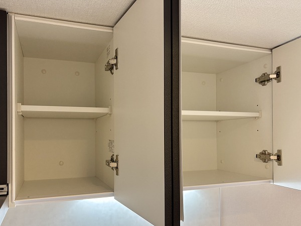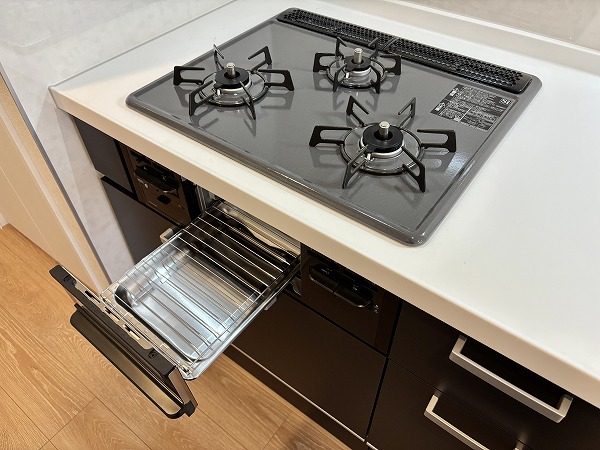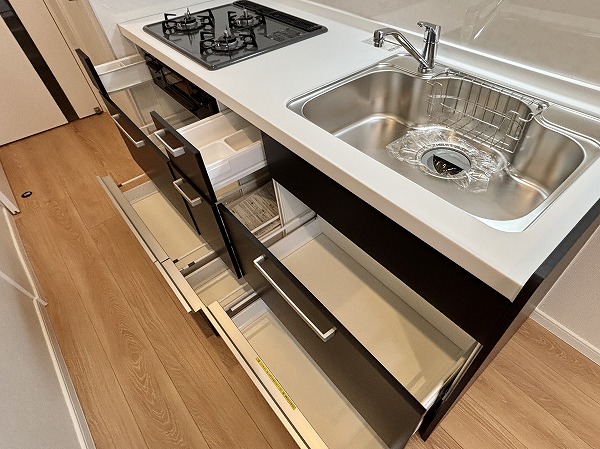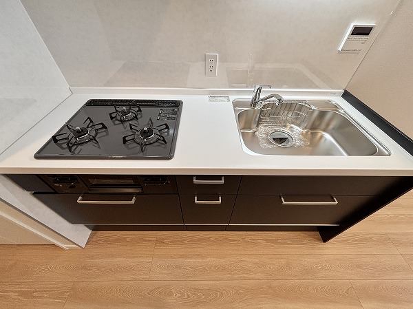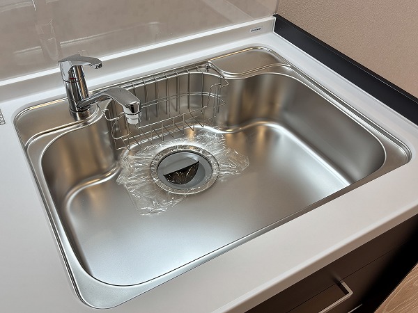 落ち着いたブラウンと白のシックなシステムキッチン。は掃除しやすく、水回りのストレスも少なめです。大きなシンクでお皿洗いもスムーズに。さらに浄水器一体型水栓と収納も充実し、使い勝手抜群です。