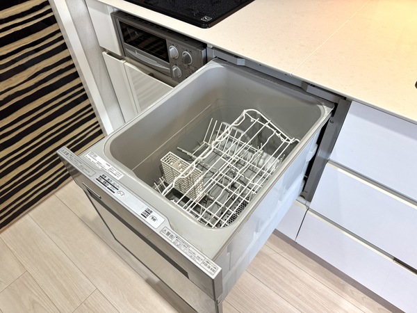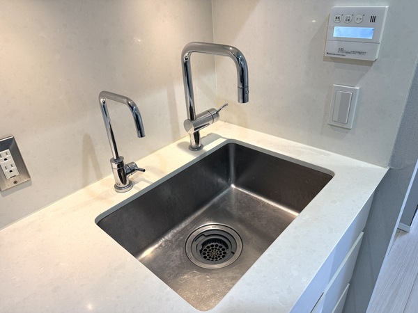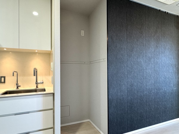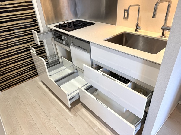 マットな質感がかわいいキッチンはコの字型になっていて、作業スペースが広いという特徴があります。ご家族と一緒に作業をすることも可能ですね!1LDKながらキッチンシンクや食洗機がファミリー向けの大きなサイズなので、ご友人をお招きしてのホームパーティでも大活躍しますよ。収納も豊富で使い勝手の良いキッチンです。