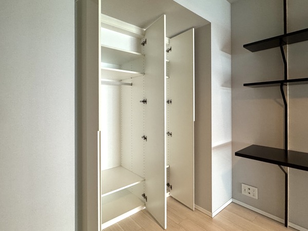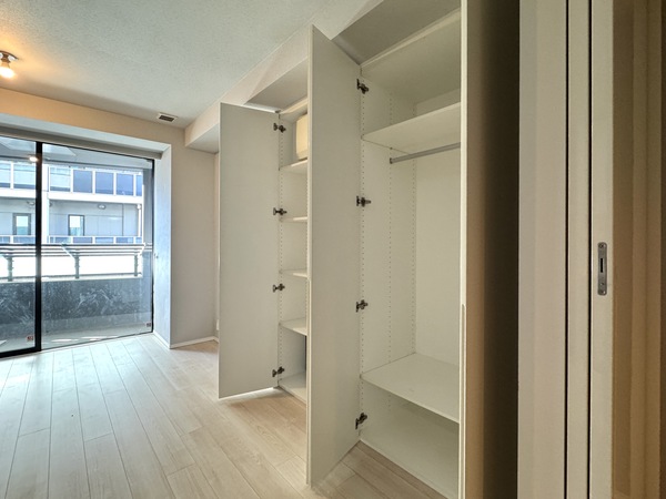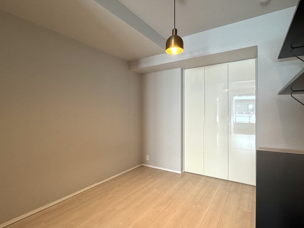 洋室は約5.7帖。ダブルベッドやクイーンサイズのベッドを置いて、ご夫婦で使用することもできます。大きなFIX窓が抜群な開放感をもたらしていますね。西側のバルコニーから太陽の光が射し込む明るいお部屋なら、前向きに毎日を過ごすことができそうです。クローゼットはワイドサイズなので、2人分のお洋服もすっきり整頓可能◎