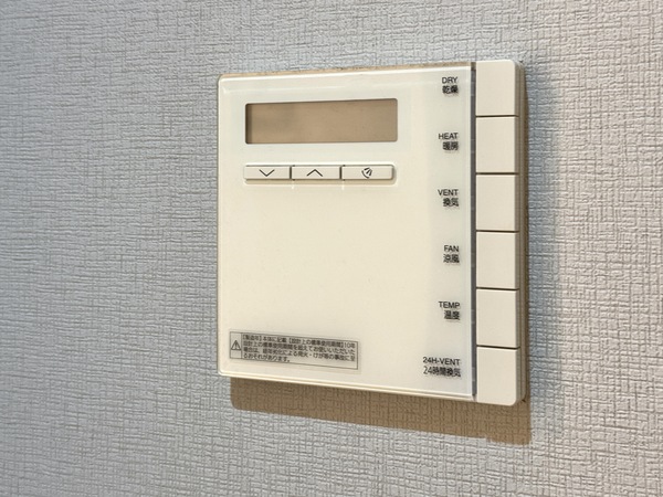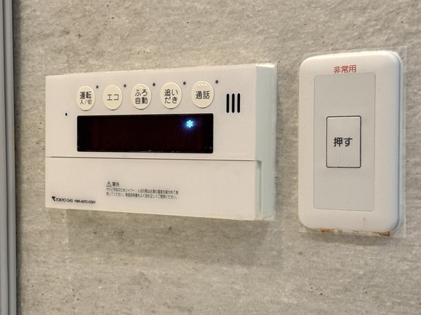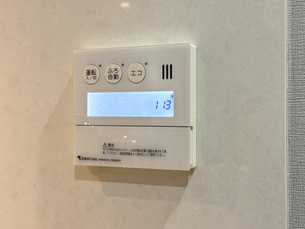 ざらりとしたタイルが用いられた、高級感漂うバスルーム。縦型の大きなミラーが開放感をプラスしています。床面が広く、ペットのシャンプーがしやすそうですね。直線的なフォルムのバスタブは横幅があるので、足を思いっきり伸ばしてご入浴いただけますよ。オートバス機能や追い焚き機能を使えば、ご家族全員が温かいお風呂に入れます。