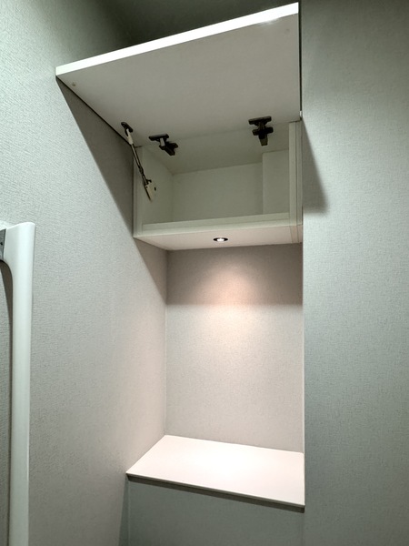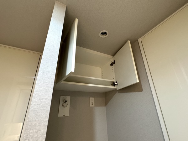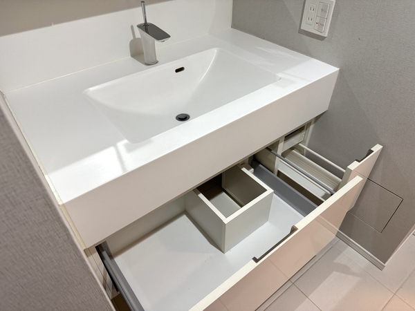 パウダールームは玄関左手に。ご帰宅後すぐに手を洗うことができますね♫ベージュやブラウンを基調とした空間に、異なる質感のタイルがアクセントをプラス。モダンで洗練された空間です。私が印象に残ったのは収納の多さ。洗面化粧台には大きなキャビネットが備わっていて、スキンケア用品などをたくさんしまえます。リネン庫や洗濯機置き場上部に吊戸棚もご用意。