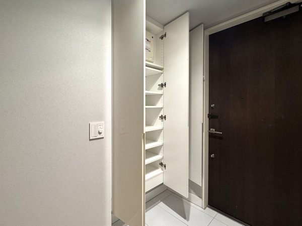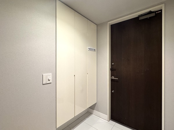 共用廊下を進むと、木目調のデザインが素敵な玄関ドアが現れます。ツーロックドアを開けばそこには白を基調とした玄関が…♪タイル貼りの土間は広く、スーツケースやベビーカーなどを一時的に置いておくことが可能です。玄関右手には大きなシューズインクローゼットがありました!靴を集めるのがお好きな方も、これだけスペースがあれば置き場所に困らないのでは。