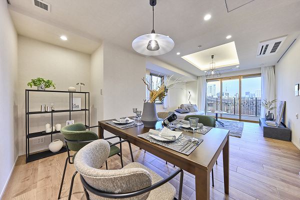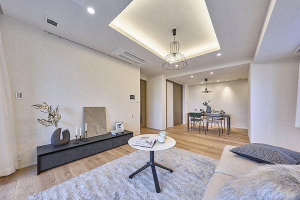お部屋は専有面積93.28㎡の2LDK。2025年12月にリノベーションが施され、上質で軽やかな住空間へと整えられました。住まいの中心となるのは、約17.6帖のリビングダイニング。角住戸ならではの2面採光により、時間帯によって表情を変える自然光が室内を優しく照らします。すっきりと整った長方形の空間は家具の配置もしやすく、ソファやダイニングテーブルをゆったり配置できそう。家族の団らんはもちろん、友人を招いて過ごす時間も心地よく楽しめる広がりです。