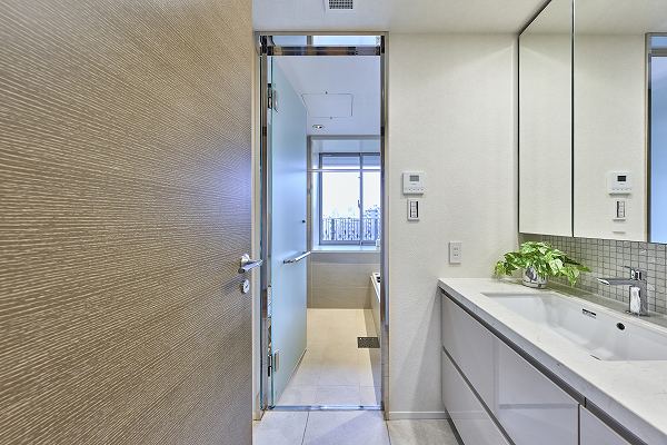 パウダールームには洗面化粧台とリネン庫、バスルームを集約。動線がコンパクトにまとまり毎日の身支度や家事もスムーズに♡バスルームは大きな窓が設けられた開放的な空間で、1620サイズのゆとりある浴室はまるでホテルのような上質な雰囲気。追い焚き機能も備わり、ゆったりとおくつろぎいただけますよ。