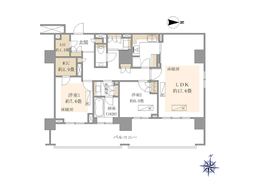 約7.6帖と約6.0帖の洋室は廊下から独立しており、プライベート空間として落ち着いて使える配置。主寝室には床暖房とウォークインクローゼットを備え、快適さと収納力をしっかり確保しています。さらに1620サイズのゆとりあるバスルームやワイドバルコニーなど、日常を少し贅沢にしてくれる要素も随所に♡