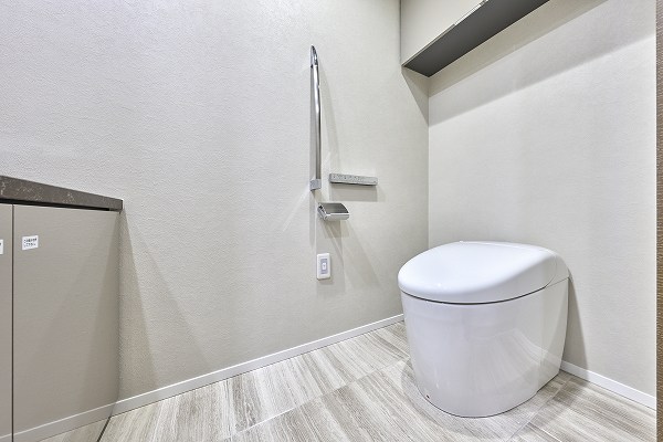 シンプルで洗練されたホワイトインテリアのトイレスペース。タンクレス仕様により、空間全体がすっきりとした印象にまとまっています。手洗いカウンターが備わっているため、使い勝手の良さはもちろん、来客時にもスマートに対応できそう。トイレットペーパーなどの備品は吊戸棚へどうぞ!