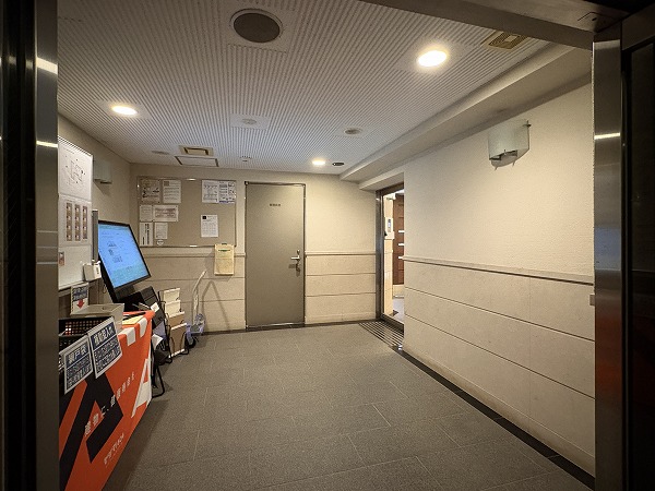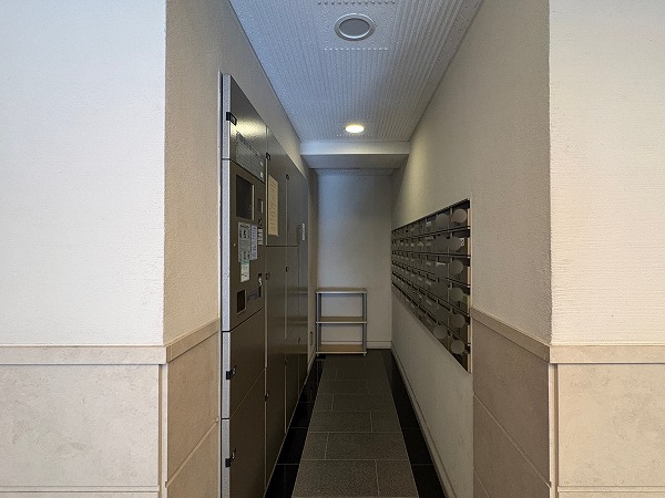 エントランスはこちら。オートロック式の扉の右には管理人室があり、左にはメール・宅配ボックスが設置されておりました。室内は明るく、非常にセキュリティレベルが高い印象です。