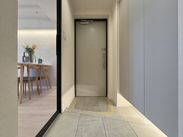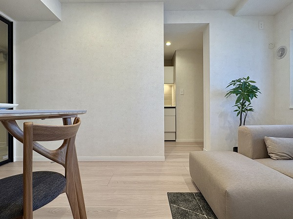 玄関に上がると石調タイルのフロアが正面に伸びる廊下がありました。廊下からメインルーム・トイレ・パウダールーム・洋室へとそれぞれ枝分かれしており、動線が良いです。宅配業者の方などに、居室を見られる心配がないというメリットもあります◎