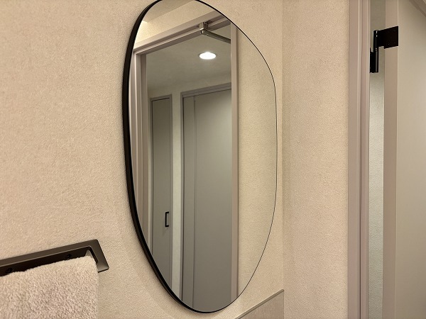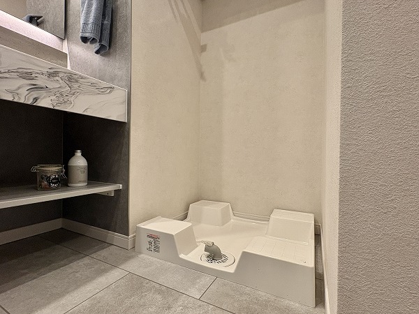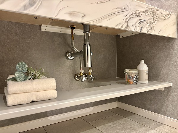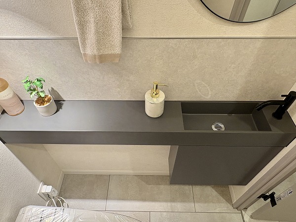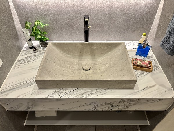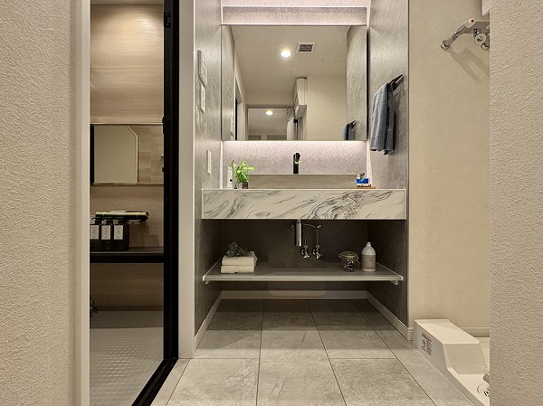 化粧洗面台は石調デザインのスタイリッシュなデザイン。まるでカフェのレストルームのような雰囲気が、気分を上げてくれること間違いなし。パッと明るい室内で、毎朝のメイクアップやヘアスタイリングも完璧に✧