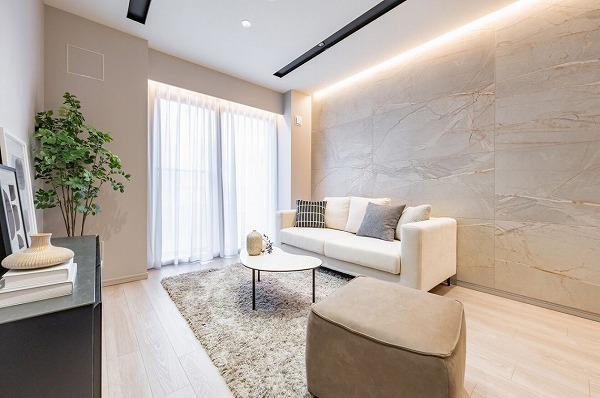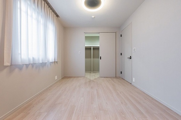 約13.1帖のメインルームは縦長の形状で、自然とリビングとダイニングをゾーニングできる設計。ストーン調のアクセントクロスがさりげなく上質さを添え、間接照明の柔らかな光が空間を包み込みます。実際に立ってみると光と素材感のバランスが心地よく、長く居たくなるリビングだと感じました。約7.2帖の洋室はデッドスペースが少なく、家具配置がしやすい整形空間。約2.1帖のウォークインクローゼットを備え、衣類から季節家電までしっかり収納可能です。もう1つの6.7帖の洋室は、大きな掃き出し窓から午後のやさしい光が差し込む明るいお部屋。シンプルな内装なので、自分好みのインテリアで彩る楽しみも広がります。
