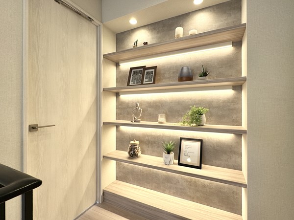 テレビを配置するであろう壁面上部にはウォールシェルフが造作され、お気に入りの雑貨やグリーン、アートなどをディスプレイするのにぴったり。暮らしの中に“好き”を散りばめる楽しさが詰まったこだわりの壁面です♡