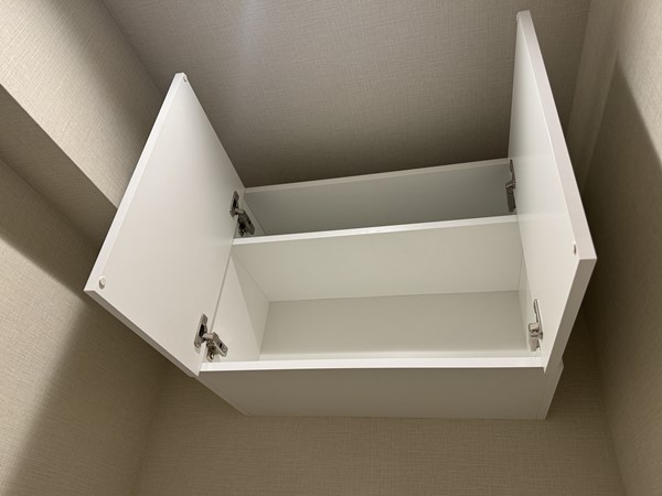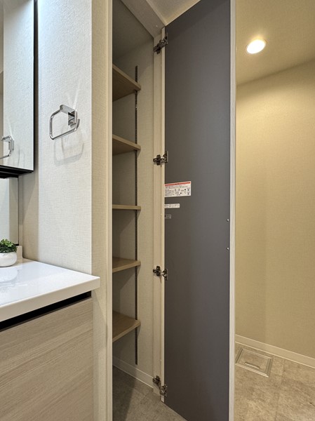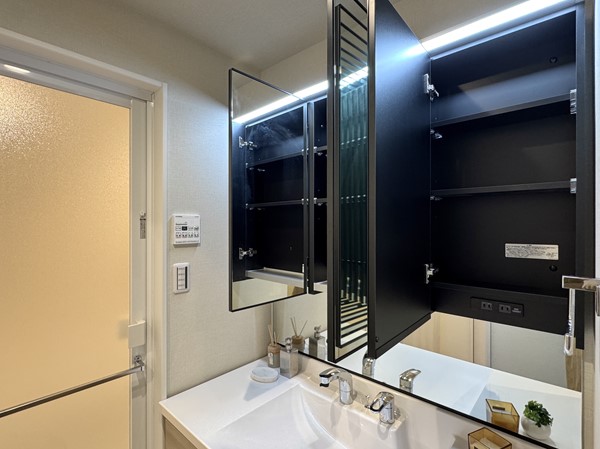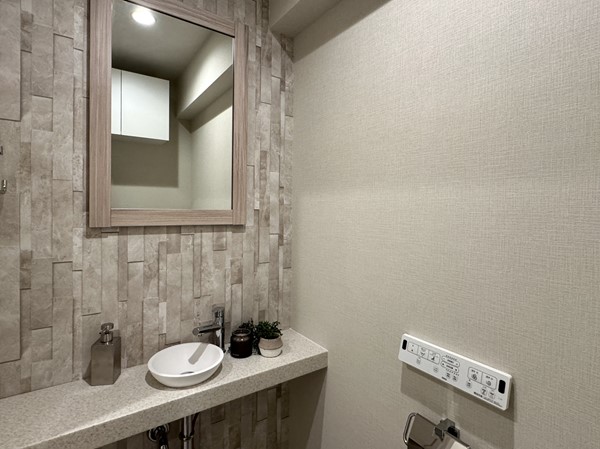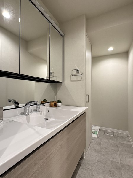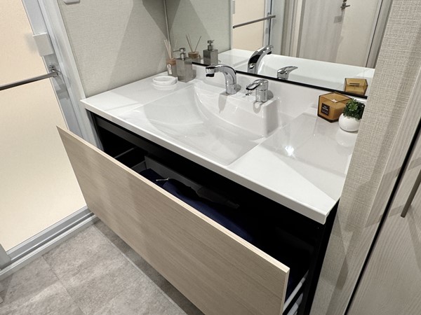 パウダールームには洗面化粧台を設置し、バスルームやトイレとコンパクトにまとまった水回り空間に仕上がりました。効率的な動線で日々の身支度や掃除がスムーズに行え、使い勝手の良さを実感していただけます。