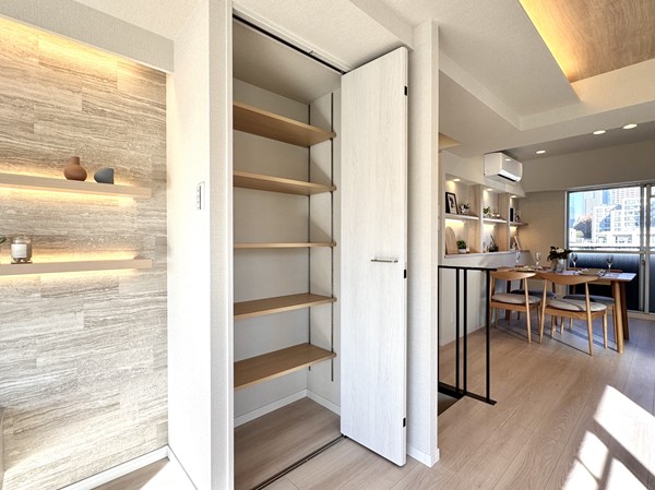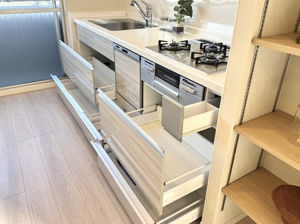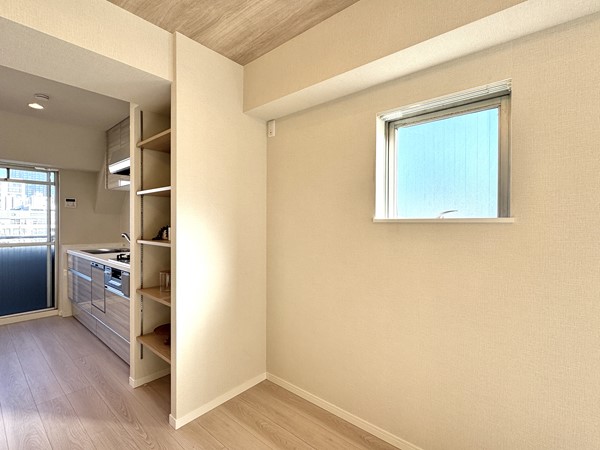 玄関を入ってすぐの場所にキッチンを配置した機能的なレイアウト。廊下部分に設けることで生活空間を広々と確保できていますね◎コンパクトながら動線が良く買い物帰りもすぐにキッチンへアクセスできるため、片づけもスムーズ。