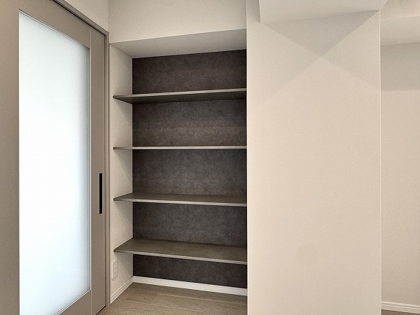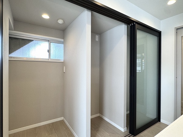背面にある冷蔵庫置き場とパントリーは、三連の引き戸によって目隠しが可能になっており、すぐ手の届く位置にありながら生活感が出すぎることもありません。