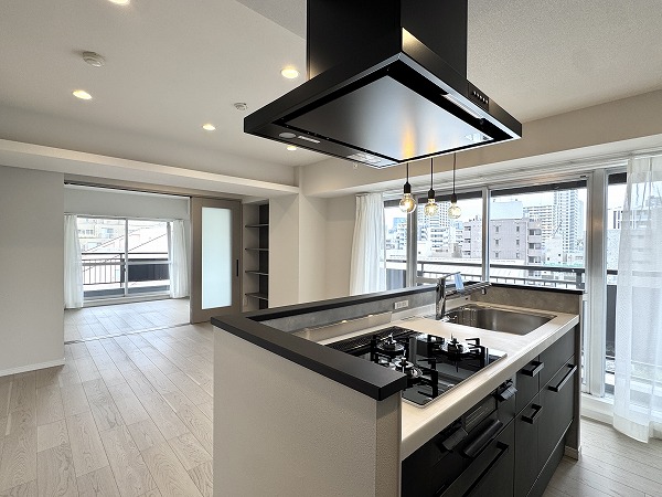優れた動線と開放感が魅力のアイランド型のレイアウトに、サイドに大きな窓がある清々しい空間設計に。