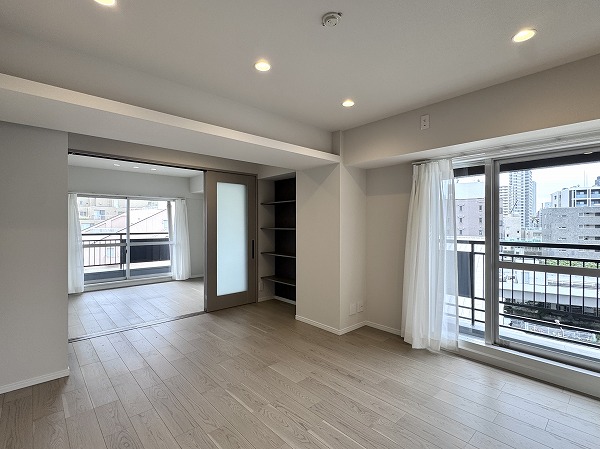 ご紹介したのは7階部分の2LDK、専有面積50.37㎡のお部屋。南&東向きのL字型のバルコニーに面した居室は大きな窓が多く開放感抜群。視線が自然と外に抜けるため実際の広さ以上に広々と感じられる空間でした。